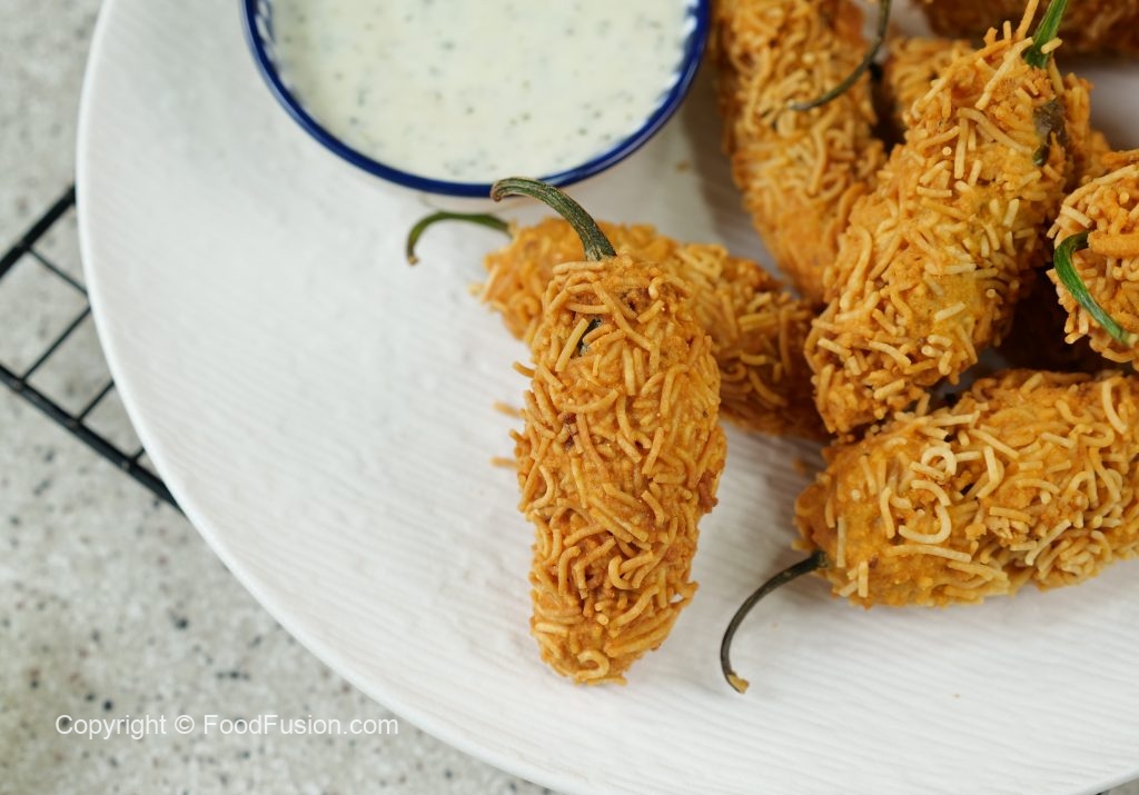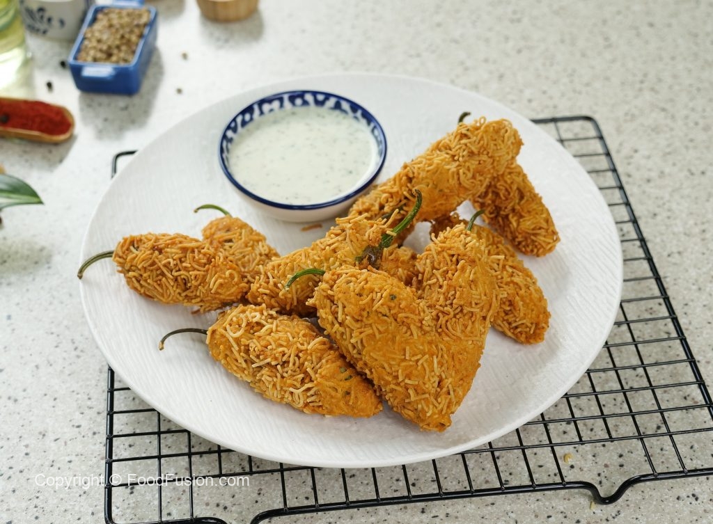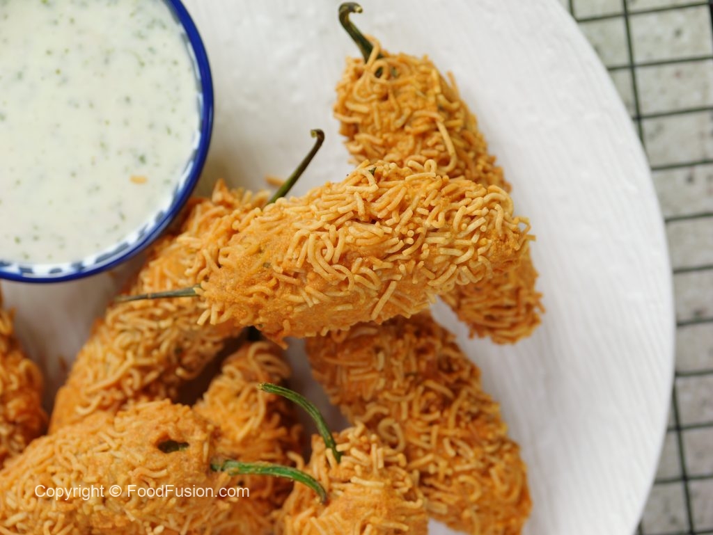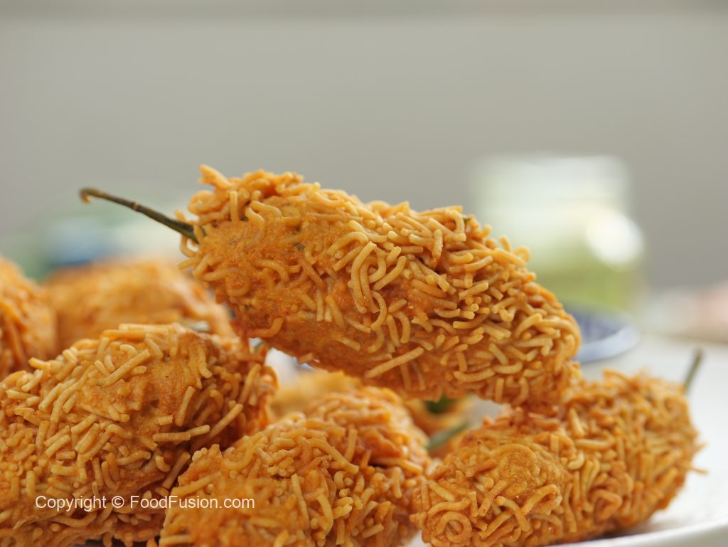 -Stuff green chillies with prepared pickle mixture then dip in prepared pakora batter & coat with nimco sev.