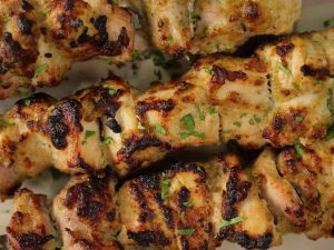 -Skewers ko (jaltay hoye koyla) bbq grill per tamam sides sa grill ker lein aur bech bech mein oil laga lein.