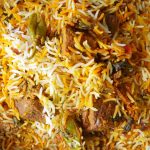 Add & spread half quantity of boiled rice,reserved gravy,steam cooked beef pieces,fresh coriander, mint leaves,fried onion and remaining quantity of boiled rice.
