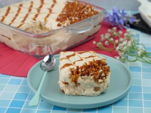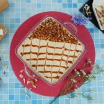 Garnish with caramel sauce,caramel crunch & serve chilled.