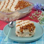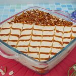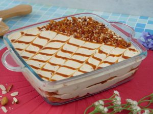 In a serving dish,add a layer of plain sponge cake,drizzle caramel sauce,caramel cream,plain sponge cake,caramel sauce,caramel cream and spread evenly.