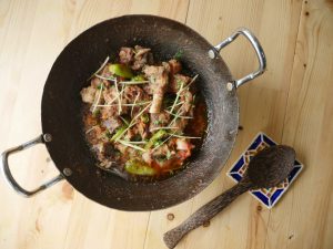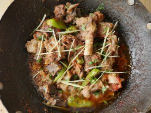 In wok,add mutton with bones,fat and salt.