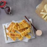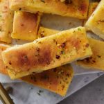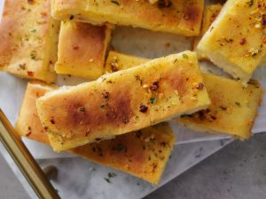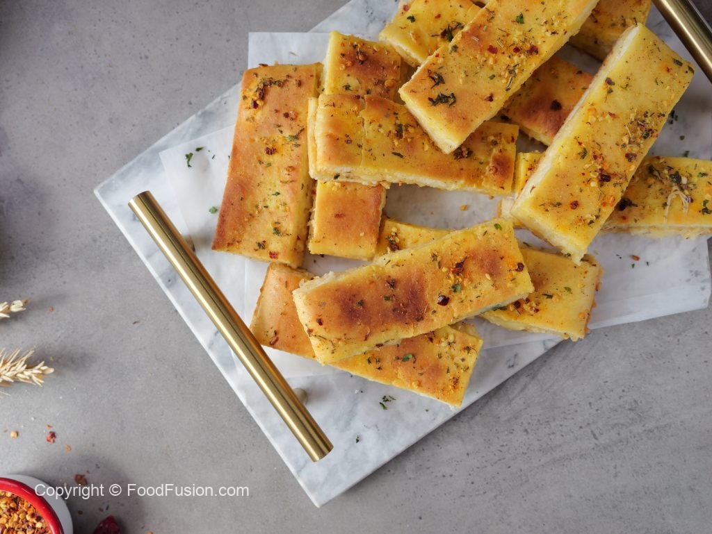 -Tayyar garlic butter laga ker sticks mein cut ker lein.