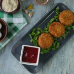 Again grease hands with oil and spread mixture on your palm,add prepared greens mixture,cover the filling and make cutlets of equal sizes (makes 10).