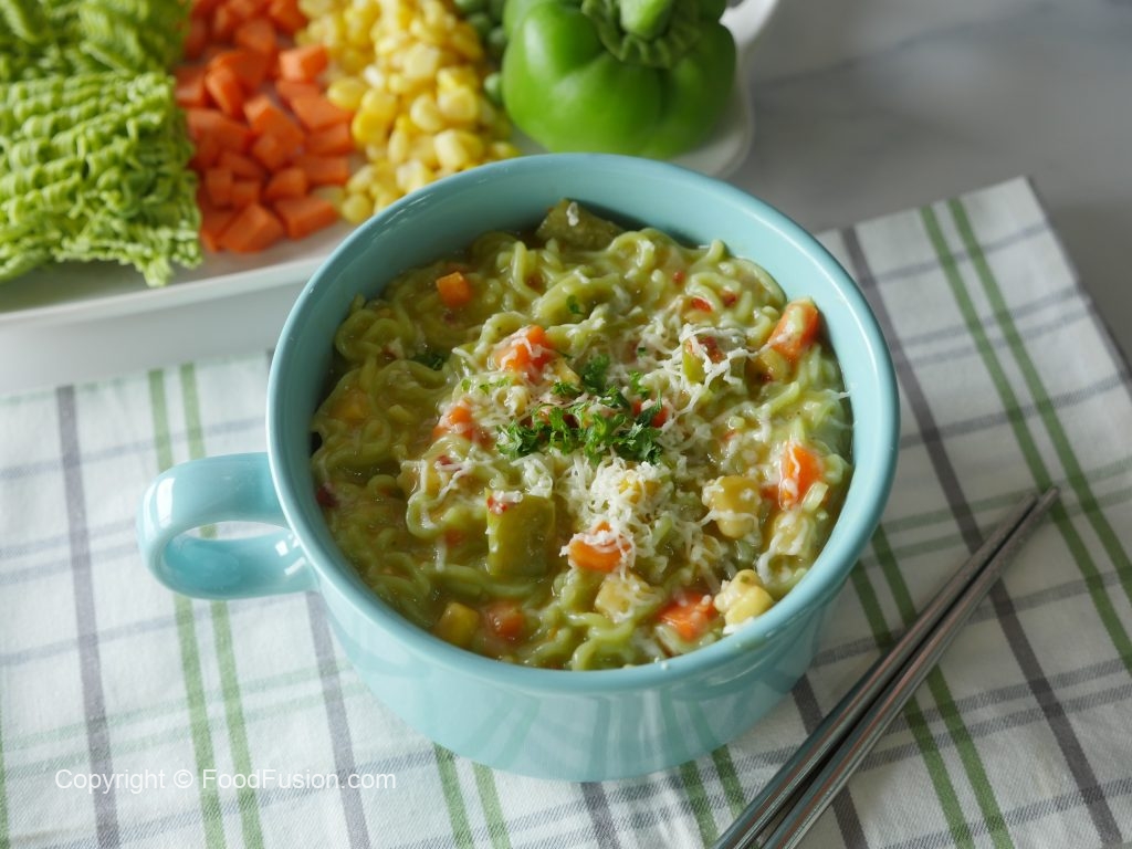 Shimla mirch,kernel corns,green noodles cake,taste maker,soy sauce,lal mirch crushed,namak aur cheddar cheese dal ker ache tarhan mix karein.