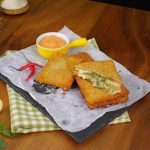 -Place plastic sheet on a cutting board, add chicken mixture (55g), flatten it, add cheddar cheese slice, prepared stuffing, now gently fold & make in tile shape.