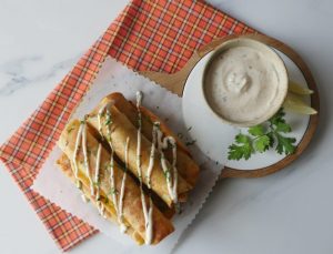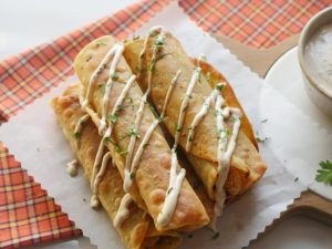 Corn tortilla per cheese mixture aur chicken fries dal ker roll ker lein aur toothpick laga lein.