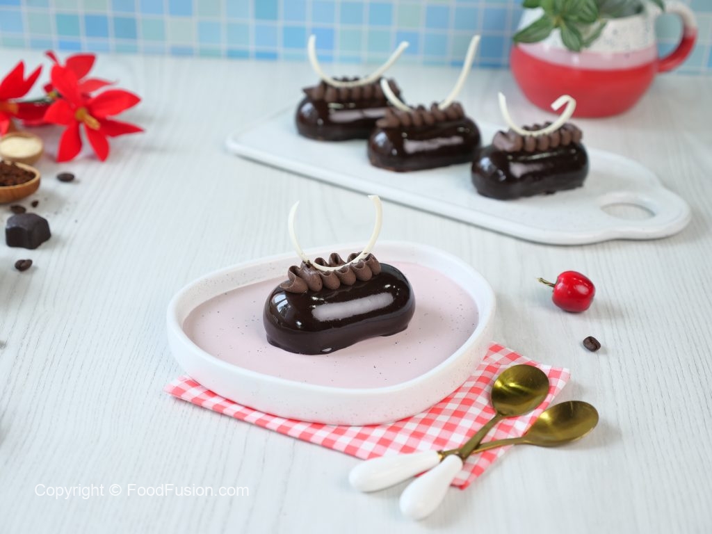 -Pipe out the chocolate mocha mousse in oval shape silicone cake mold,spread evenly & place a thin layer of sponge cake,press gently & freeze for 6 hours or overnight in freezer.