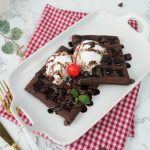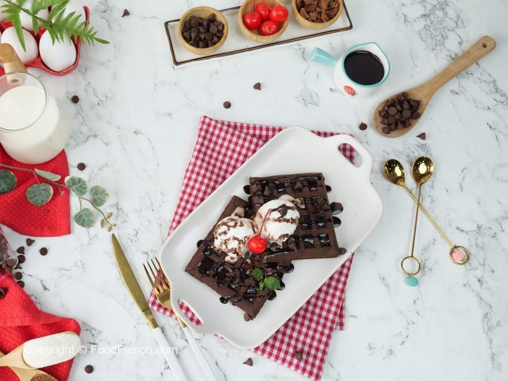 -Chocolate waffles per vanilla ice cream,tayyar chocolate sauce & chocolate chips dal dein,cherry & mint leaves sa garnish ker ka serve karein.