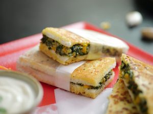 -Add butter,garlic,red chilli crushed,flip the sandwich & cook other side until golden & crispy (makes 4).