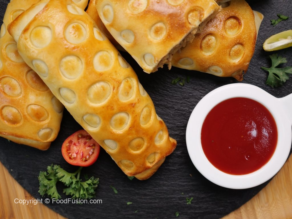 -Add 2 tbs of prepared chicken filling on rolled dough & roll it till half.
