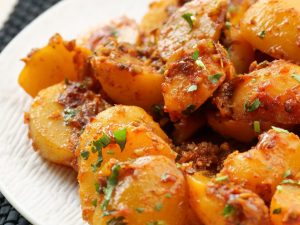 Cast iron frying pan mein olive oil aur lehsan dal ker ache tarhan mix ker lein.