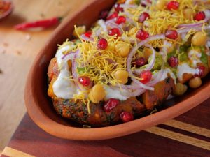 -In a serving plate add fried Aloo tikki, smashed it, add boiled white chickpea, yogurt, gur imli chutney, prepared green chutney, onions, boiled white chickpea, daal sev, pomegranate corns & serve!