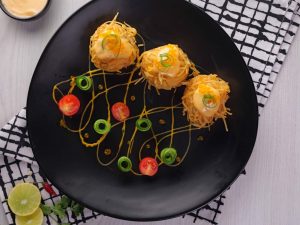 -Garnish karen bang bang sauce, caviar, green onion, cucumber aur cherry tomato ke saath.