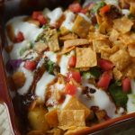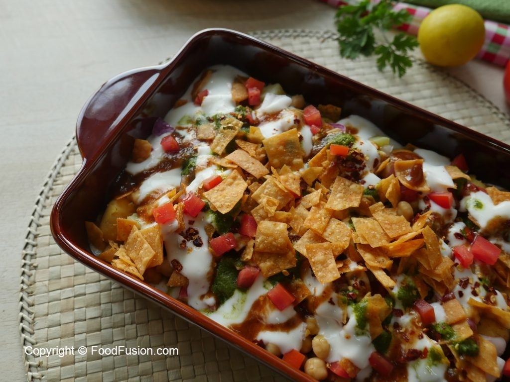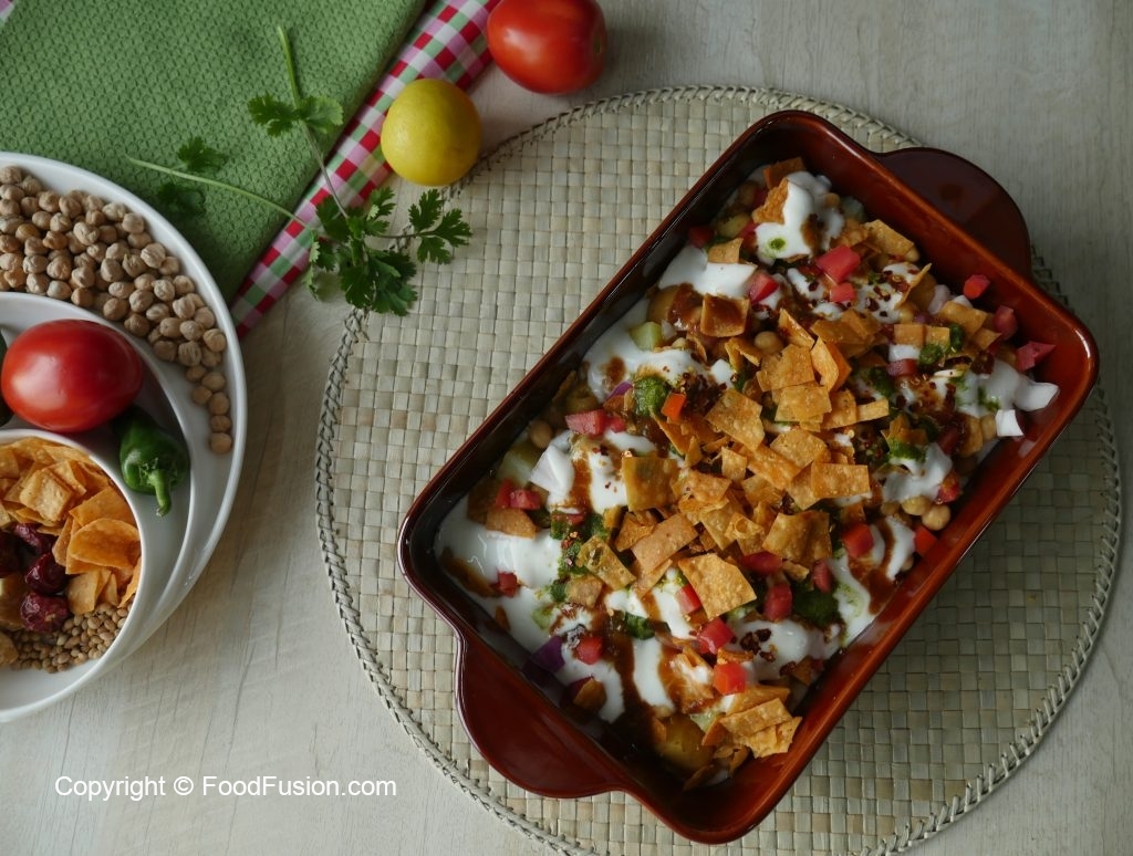 Serving dish mein dahi,phulkiyan,lal mirch crushed,chaat masala,aloo,chanay,tamatar,pyaz,meethi chutney,hari chutney,papri,dahi,meethi chutney,hari chutney,lal mirch crushed,tamatar aur papri dal ker serve karein!