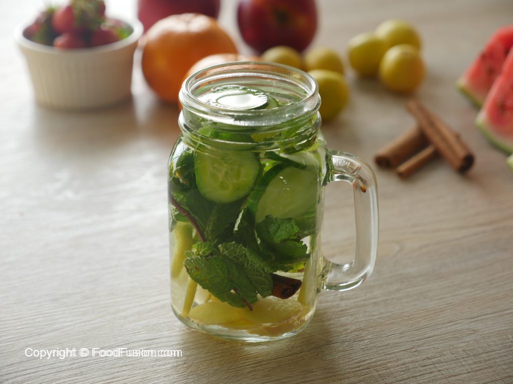 Jug mein kheera,lemon slices,adrak,darchini,podina aur thanda pani dal dein aur stir ker ka cover ker lein