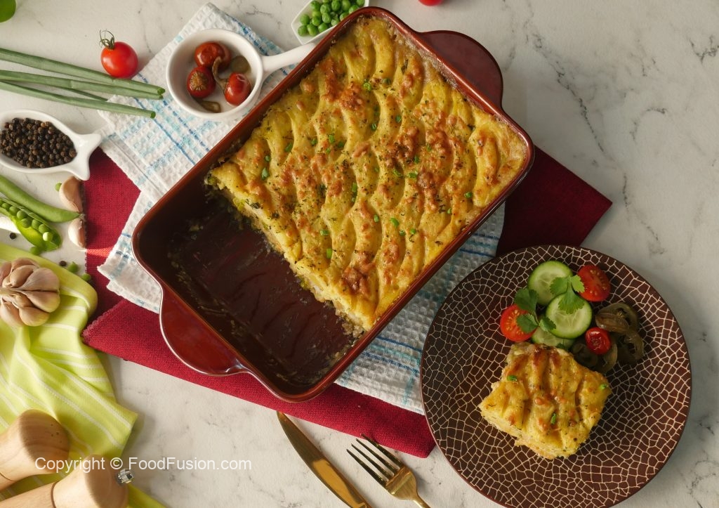 In a 10 x 4 inch baking dish layer prepared sauce, fried fish, mozzarella cheese, cheddar cheese & prepared creamy potato. Level it with the help of spoon & make some design.