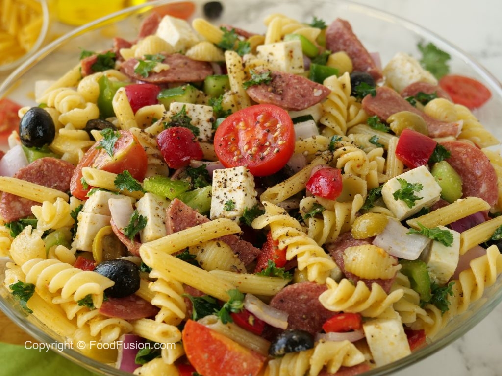 -Red bell pepper,kheera,black olives,green olives,cherry tomatoes,shimla mirch,beef pepperoni, pyaz,cottage cheese aur fresh parsley dal ker ache tarhan toss ker lein.