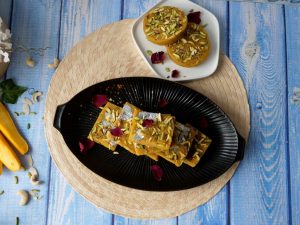 Chandi warq aur pista sa garnish ker ka gently press ker lein.
