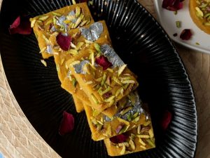 Garnish with edible silver leaves,sprinkle pistachios & press gently.