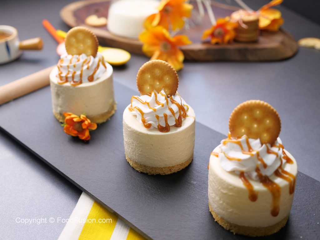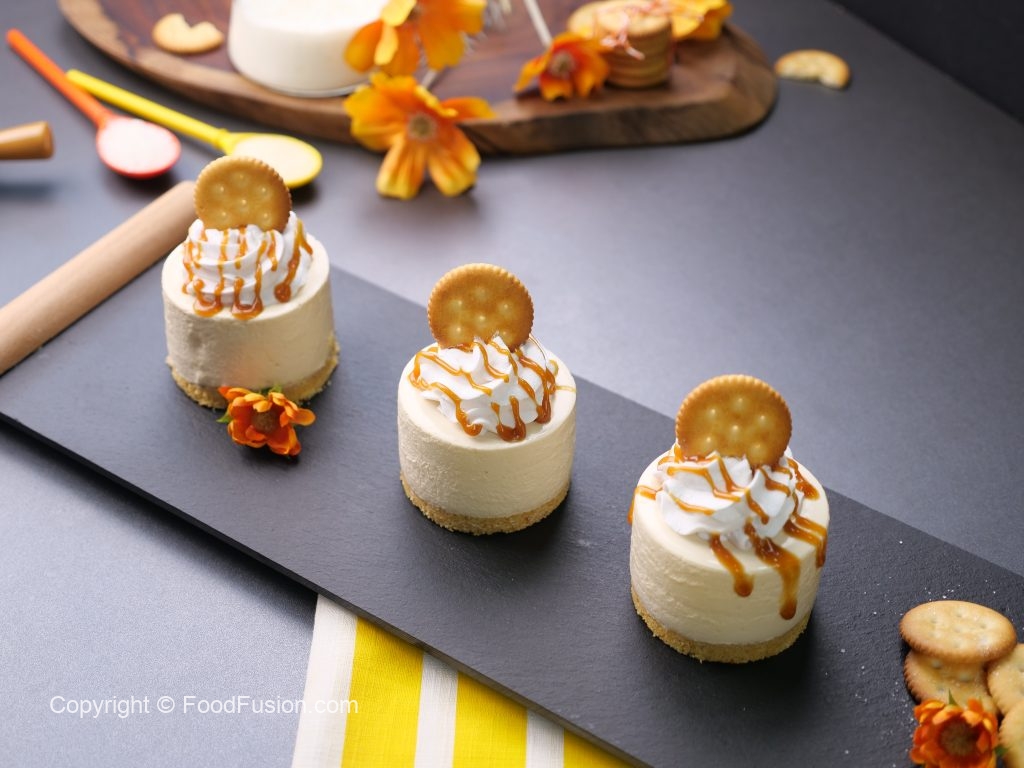 -Take out mini cheese cakes from molds,garnish with whipped cream,drizzle salted caramel sauce & saltish biscuit & serve (makes 4-5).