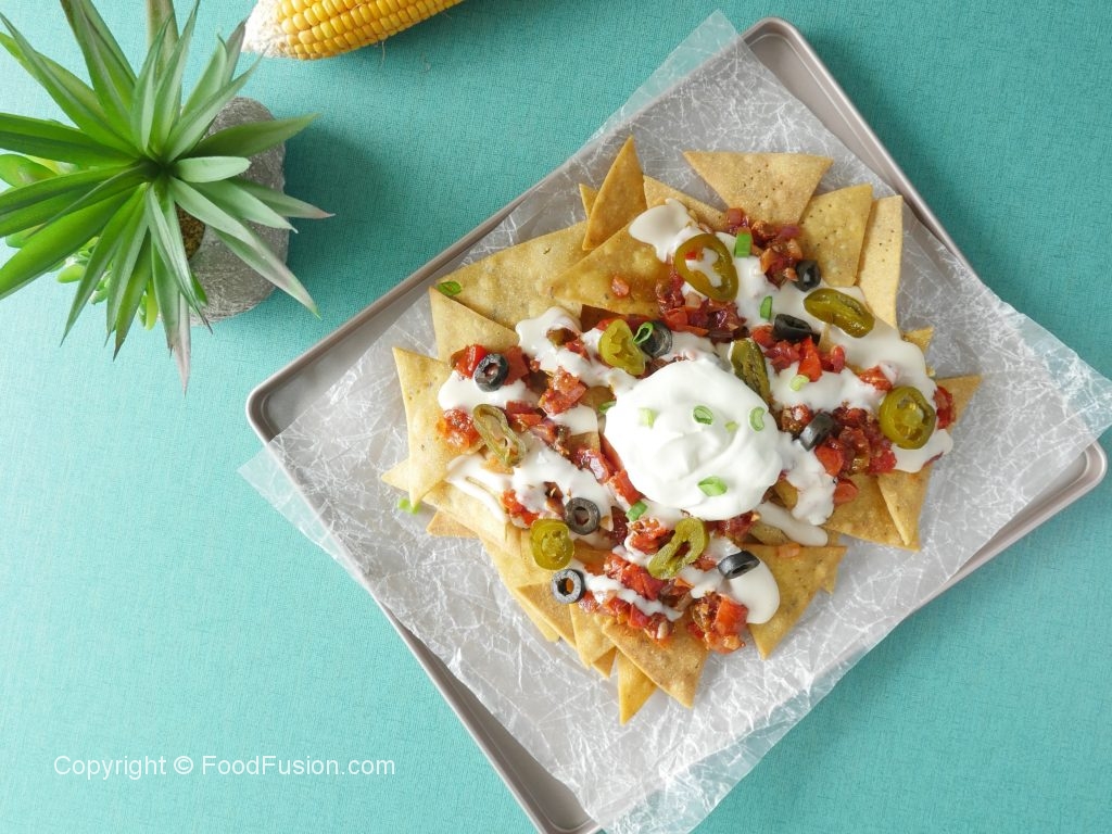 Top nachos with salsa,cheese sauce,jalapenos,black olives,green onion leaves,sour cream & serve!