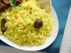 -Chawal,kishmish,darchini,dried lemon,zafran,laung,hari elaichi,sabut kali mirch,tez patta,haldi powder aur pink salt dal dein aur darmiyani ancch per 2-3 minutes kliya ache tarhan mix ker lein.