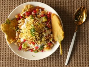 Platter mein palak pakora,hari mong daal,chanay,aloo,pyaz,tamatar,dahi,tayyar hari chutney,tayyar khatti chutney,nimco sev,anaar,lal mirch crushed,chaat masala aur hara dhania dal ker serve karein.