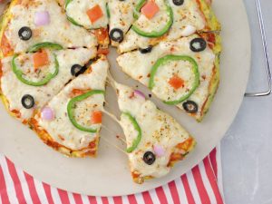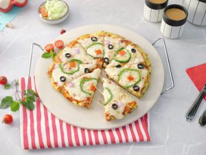 -Add & spread pizza sauce,add cheddar cheese,mozzarella cheese,capsicum,tomato,onion & black olives.