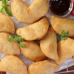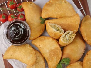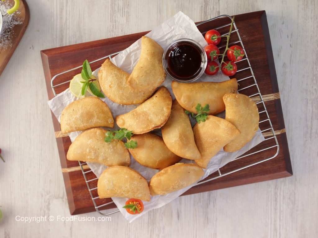 -Pani laga lein aur rolled dough ko filling ka upper dal dein phir round cutter ki madad sa half-moon cut ker lein & edges ko gently press ker ka seal ker lein.