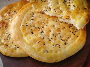 Brush on each naan and sprinkle black & white sesame seeds on top.