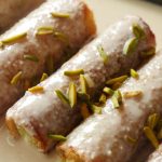 Serving dish mein bread rolls ups rakh dein aur neem garam doodh dal dein.