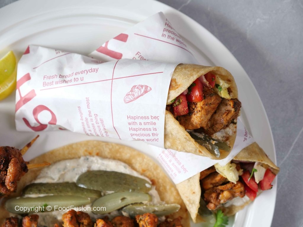 -On tortilla,add& spread prepared tahini sauce,paprika powder,prepared chicken,prepared salad, pickled cucumber,fold & wrap in butter paper & serve!