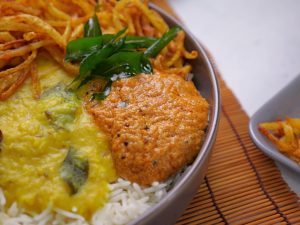 -In a serving bowl,add rice,daal,crispy aloo,prepared teekhi chutney,pickle onion,fried curry leaves & serve!