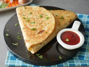 Vegetable filling dal ker tortillas/roti ko triangle mein fold karein aur aloo mixture dal ker seal ker lein (makes 2).
